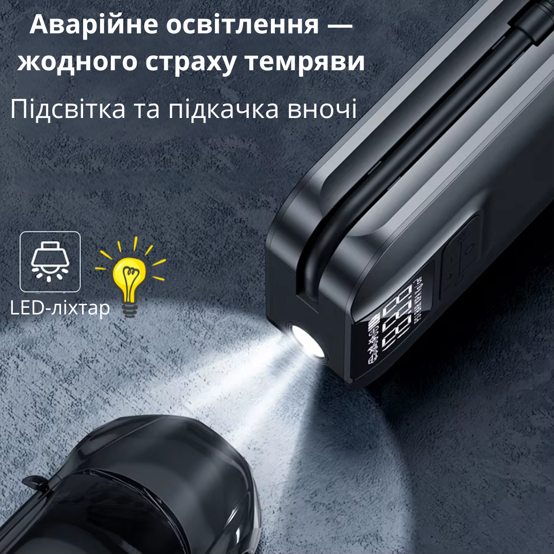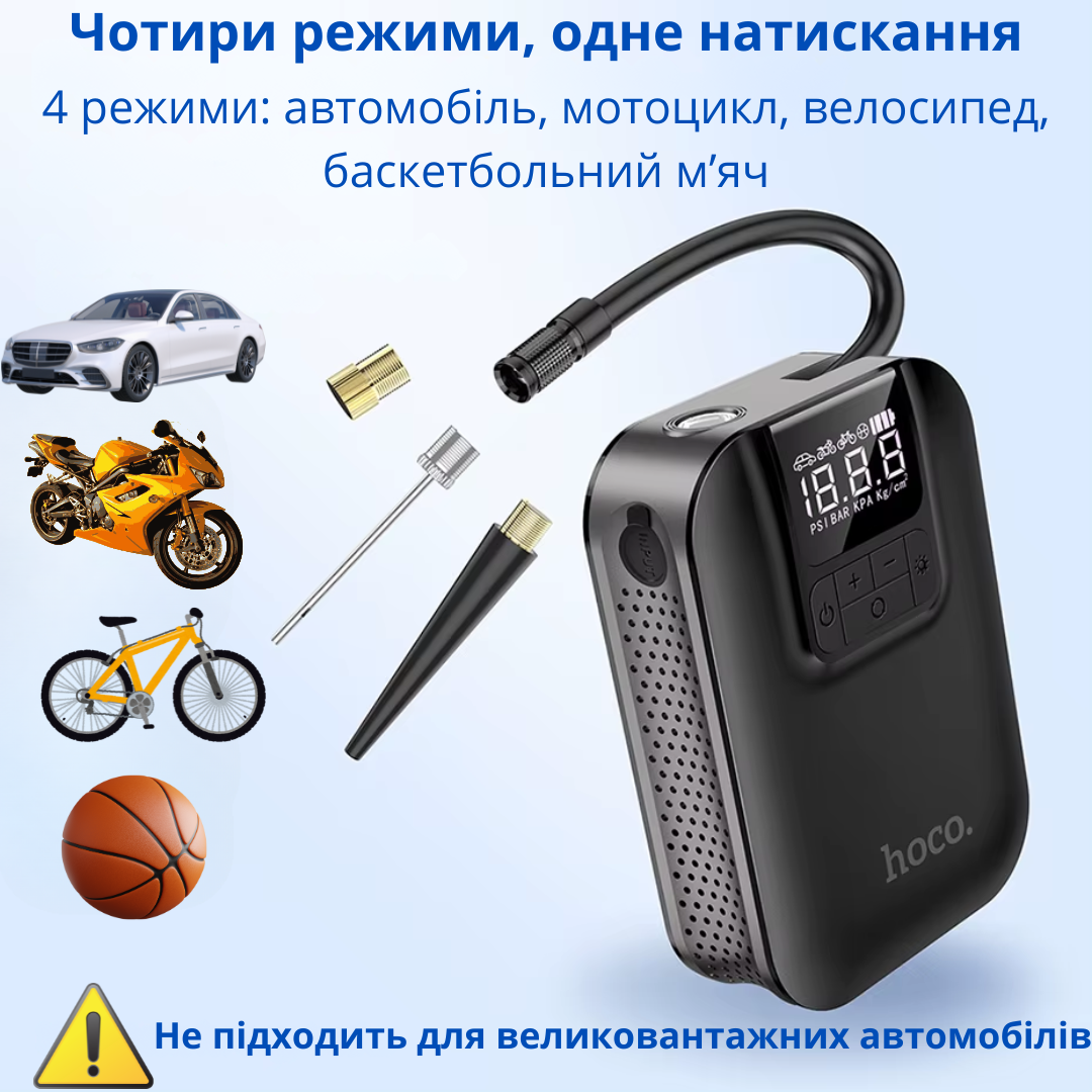 За допомогою компресора Hoco можна не тільки швидко накачати колесо легкового автомобіля або позашляховика, а й швидко відремонтувати проколоту шину. Його також можна використовувати вночі, тому що є ліхтарик який чудово висвітлює робочу зону.