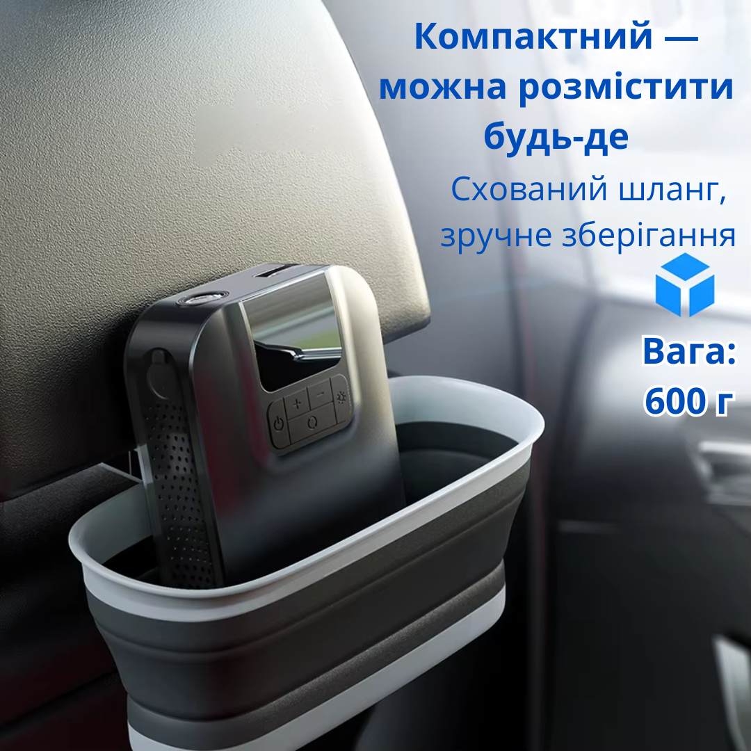 Модель оснащена цифровим дисплеєм для контролю тиску та інтелектуальною системою автоматичної зупинки після досягнення заданого значення. Це дозволяє уникнути перекачування та забезпечує безпечну експлуатацію. Компактний корпус легко поміщається у бардачок або багажник, а просте керування робить насос зручним навіть для новачків.