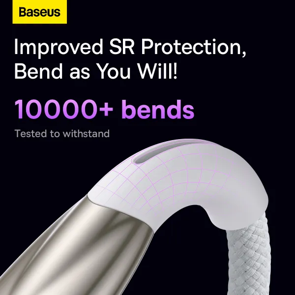 Кабель вирізняється підвищеною довговічністю. Нейлонове обплетення високої щільності захищає провід від перегинів, стирання та розтягування, а конектори з цинкового сплаву стійкі до окислення й механічних пошкоджень. Посилена зона біля штекерів із матеріалу TPE мінімізує ризик перелому — найпоширенішої проблеми кабелів.