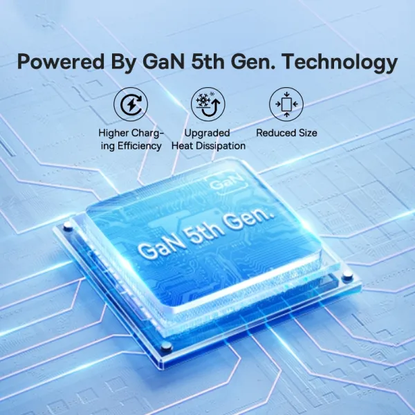 Технологія GaN5 забезпечує підвищену ефективність роботи та зменшує нагрівання, що позитивно впливає на довговічність самого адаптера і підключених пристроїв.